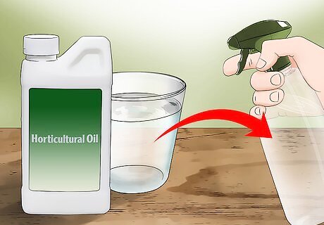 Dilute horticultural oil with warm water in a spray bottle. Horticultural oils are oil-based products that smother insects and their eggs. You can purchase horticultural oil at a home and gardening store or online. Before diluting the horticultural oil, make sure to read the instructions that came with it so that you know how much water you should use and whether it's safe to use on your plants. Use traditional horticultural oil in the summer. Use dormant horticultural oil in the fall and spring.