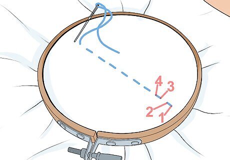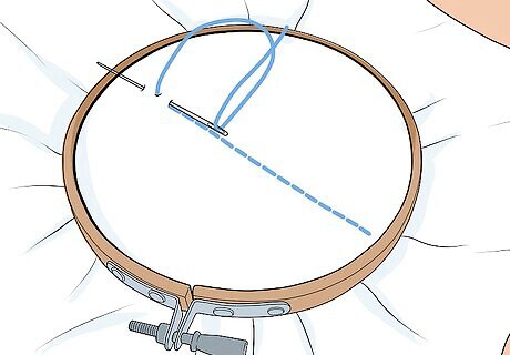 Try a running stitch. Once you have the fabric secure in the embroidery hoop, you can try one of the most basic stitches: the running stitch. Thread the needle into the fabric from the back so the knot is in place and the thread is secure. Then, come up through the fabric and make one straight stitch. Leave a little space and then come back up through the fabric. You've now done a running stitch. You can try doing a running stitch straight across the fabric in a straight line. You can also try doing a running stitch around the circumference of the embroidery hoop to practice doing it in a circular shape.