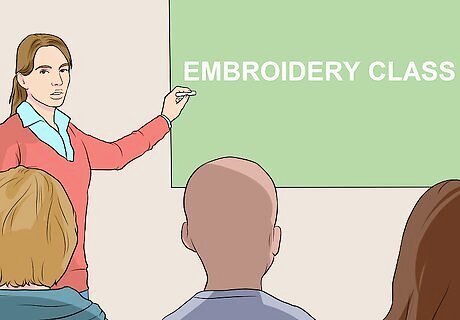 Take an embroidery class. You can also improve your skills by enrolling in an embroidery class. See if embroidery classes are offered at your local community center or at school as part of a home economics program. You could also search for a local embroidery club at a fabric store or an arts center in your area. You may want to ask your parents or guardians to help you find an embroidery class you can take. They may be able to help you pay for the class and make sure you have transportation to the class.