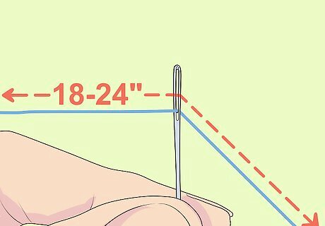 Thread the needle. Start by cutting two strands of the same thread color. Cut threads that are 18-24 inches. Group the two strands together and moisten one end of the strands by putting it between your lips. Hold the needle in your non-dominant hand with the eye of the needle facing towards you. Take the thread in your dominant hand and hold the needle and thread up to your eye level, about two inches apart. Guide the thread through the eye hole of the needle. Keep your hands steady as you do this with a firm grip on the thread with your forefinger and thumb. If the eye hole is very small on the needle, you may have to try putting the thread through the eye a few times until you get it. Make a small knot at the end of the thread once you get it through the needle. Alternatively, you can use a needle threader to help you thread the needle. Using this device will make it quick and easy to thread the needle without having to try multiple times.