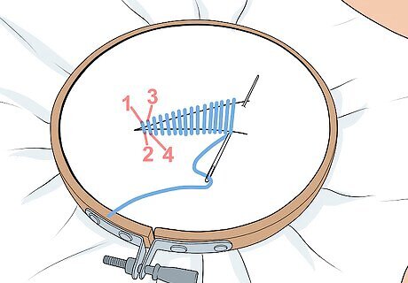 Do a satin stitch. This stitch is a bit more advanced but it can be a good one to use to fill in areas in a design with a certain color. The stitch is called a “satin stitch” because it creates a shiny, raised surface on the fabric. Start by threading the needle through the fabric from the back so the knot is secure at the back. Then, come up with the thread and place it underneath the initial hole, making a vertical stitch. Go to the top again and come back up. Then, place the next stitch below the top stitch. Continue to do this, going top to bottom with the stitch. Always go in the same direction when you do a satin stitch, such as top to bottom or bottom to top. This will keep the stitch uniform and straight.