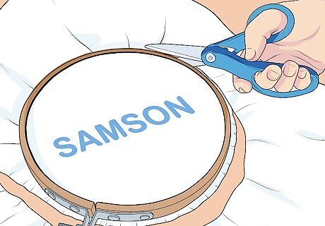Secure the embroidery to the hoop. Once you have finished the embroidery, secure the fabric to the hoop so you can hang the embroidery. You will need scissors and glue to do this. Use the scissors to trim the fabric around the hoop, leaving just enough fabric to fold over the edge of the hoop. Then, put a line of glue around the top edge of the hoop. Press the fabric into the glue with your fingers. Flip the embroidery over and let it dry on a clean, flat surface. If you are planning to mount the embroidery on another surface, you can remove it from the embroidery hoop by releasing the tightening screw. You can then glue it or sew it onto another surface as you see fit.