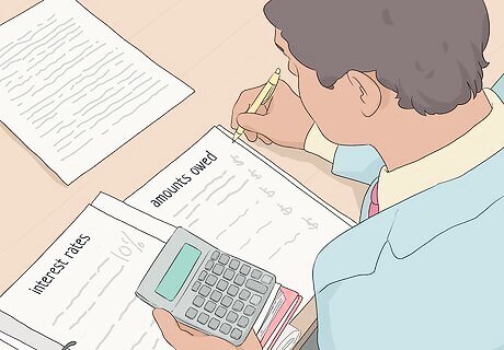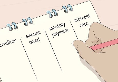 Make a spreadsheet of all your debts. Set up columns for the name of the creditor, the total amount you owe, the minimum monthly payment, and the interest rate. Then, list each of your debts. If you're married, list both your debts and your spouse's debts. For your own information, you might want to add a column to label each debt as individual or separate (although in practice, both of you are responsible for all of them).