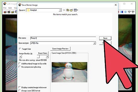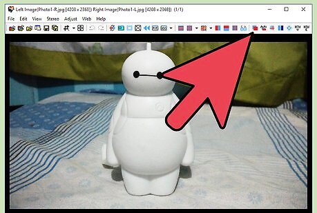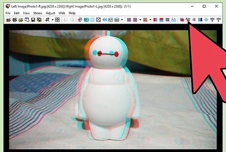 Preview the anaglyph. The multicolored icon to the left of the vertical red-blue icon is there to see your image as an anaglyph. Now that you've aligned them, click on that and put on your 3D glasses. To get a big view, click on the icon that looks like a rectangle with an X through it . That will give you a full screen view. After you've had a good enough look at it, to go back to the regular program screen, hit the Esc key. Make any adjustments in aligning the images until you're happy with it.