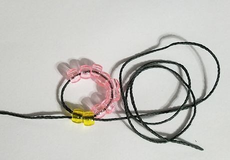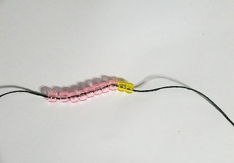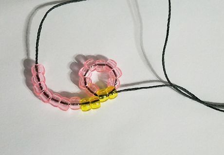 Add the first set of beads for the first petal. Take the string and thread through at least 8 pink beads. This will become the petal. Take 2 yellow beads and thread them with the string. You should see that you have 10 beads total on the same string.