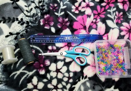 Gather your materials. You’ll need a cord or a string, beads, scissors, and a ruler. Use the ruler to measure out the string. You may cut it to about 48 inches. For the colour of the petals, you can choose any colour that you want, but for simplicity of this task, the colour will be pink. For the middle part of the flower, also known as the disk, you might as well stick to using yellow beads. Lastly, the stem will have green beads.