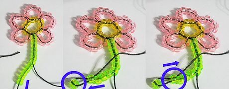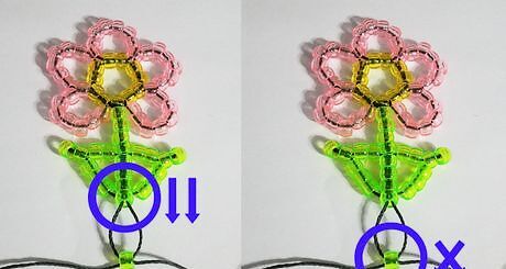 Complete the leaf. First, add two green beads to the string. Take the string and starting from the fifth bead of the stem, thread that bead, then through the sixth and seventh beads. This string should go in the same direction as the other string that has not been used.