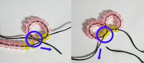 Begin to create the first petal. You will create a loop that will complete this petal. Just take one side of the string that has the pink beads and thread it through the 2 yellow beads in the opposite direction to how the yellow beads were initially threaded. You’ve created your first loop, which is now the first petal.