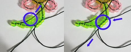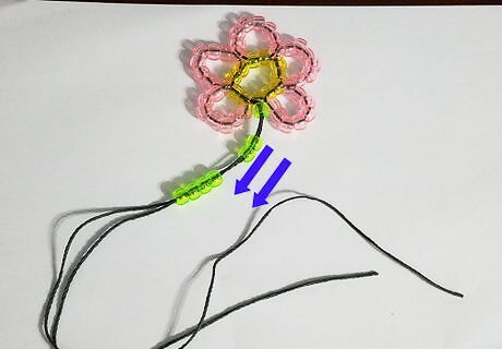 Begin the leaf. Even though you’re making the stem, you’re also about to start making the leaf. Take only one string and set that aside. Add 5 green beads to thread it through that string. Thread a loop around the fifth bead. After looping around the fifth bead, use the string to thread it through the fourth bead, going in the opposite direction. Release the thread from the fourth bead.