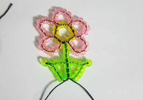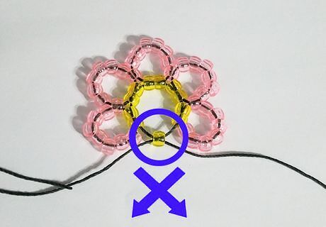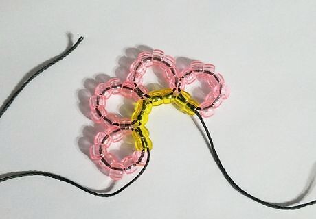 Create the rest of the petals. Simply repeat the previous steps for making the petal above. Start finishing on the left side of the flower. After you've created the second petal, just complete the third petal: add two yellow beads, then seven beads, string the last bead from the previous petal, and string through the yellow beads. Stop using the string once you've completed the third petal. For the right side, you'll start by repeating the steps for the 4th and 5th petals. Once you've finished the petals on both sides of the flower, you should see that you have two strings coming from each side of the beads. They should be at least of the same length, since you should have enough string to move on to the other steps.