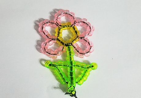 Complete the flower. When you’ve got the flower, you’ll see that you have 2 strings coming from each side. Take one yellow bead and thread that with one string from any side. Then, take the string that is opposite from the other string and thread it to the different direction. You should be able to see that you've made a criss-cross looking pattern within that bead. Tie it with a single knot. Do not cut the strings.