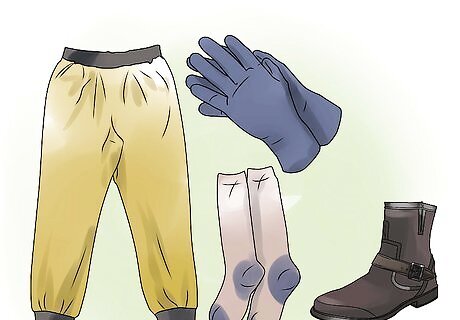 Buy the remaining beekeeping suit essentials. Your bee-tight shirt and hat are the most important parts, but in order for your suit to work, you'll need a few more items. Remember that everything should be white or light in color: Thick white sweatpants or work pants. Make sure they have tight elastic around the waist and ankles. You can also wear white workout pants if sweatpants are too hot. Tall socks. Thick gloves. Dishwashing gloves work just fine. Some beekeepers prefer to be bare-handed. Sturdy work boots. Look for boots that are ankle or calf length and made of leather or other durable material. There should be enough room around the opening of the boot so you can tuck the bottom of the pants into them.