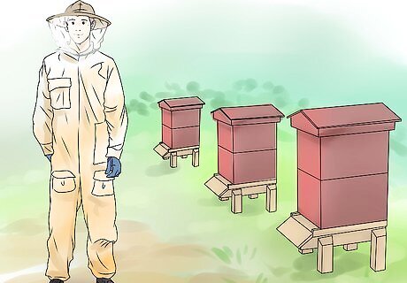 Put on your suit. When putting on the beekeeper's suit, put the hat on first, then the coveralls. Make sure the mesh of the hat is securely tucked in at the neck of the coveralls. Add gloves, socks and boots to the ensemble.