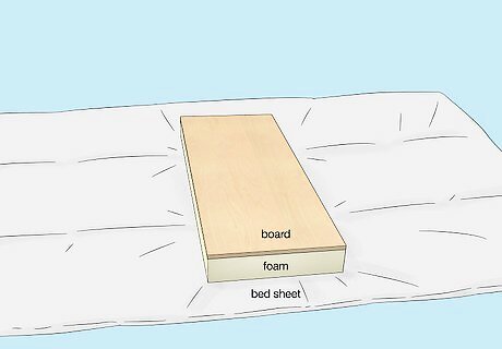 Use an old unwanted double or queen size bed sheet (fitted or flat) for the cover. Lay down the foam on the sheet. Lay the board over the foam.