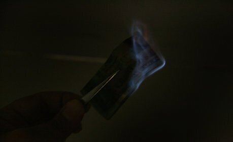 Hold the wet dollar up with metal tongs. Keep away from the bowl of solution.