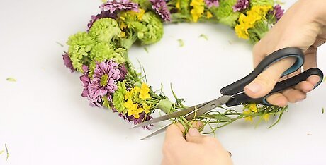 Trim any extra stems. To complete your floral headdress, use scissors to clip off any stems that are sticking out. Be careful not to cut any of the flowers or any of the florist tape or wire that holds your crown together.