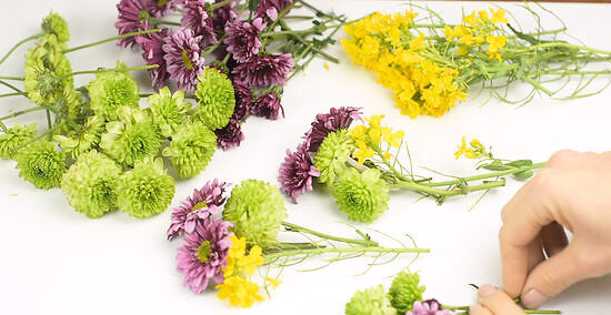 Arrange the flowers in small bunches. Gather together 1 or 2 of your main flowers, along with a few sprigs of the filler flowers (about 1 to 5 depending on how big your flowers are). Separate these into a small pile away from the rest of your flowers. Repeat this process until all your main flowers and fillers are separated into small bunches. Note that while you may not end up needing all your flower bunches, it is helpful to have them separated and arranged to your taste in case you do end up needing them all. This way, you don’t have to stop and make more as you go – they will be ready to go as needed.