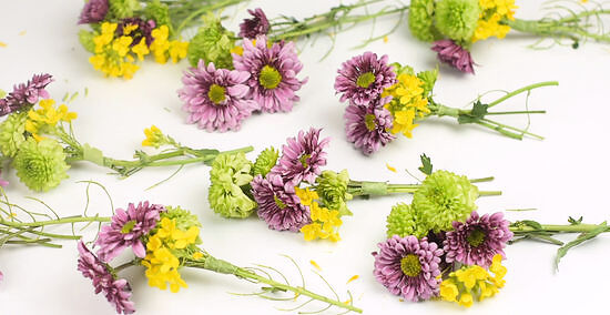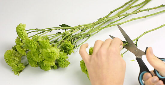 Cut your floral stems. Using scissors, cut both your main and filler flower stems about 2 inches (5.1 cm) down from the base of the flower head. You will attach the flowers together and to the florist wire crown by the stems, so it is important that you leave enough stem to do this. While the stems may look a bit long, you will be able to trim them later on.