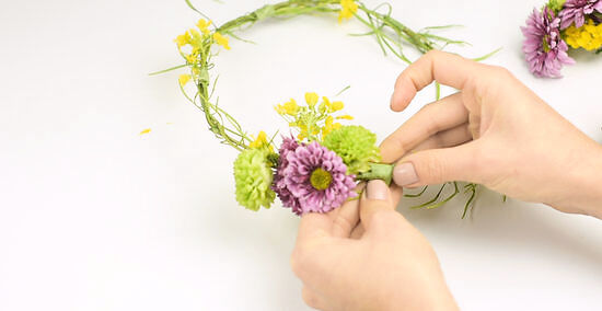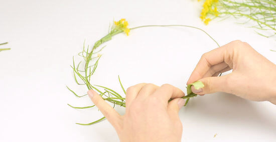 Secure your greenery to the florist wire crown. If you are using a long type of greenery, such as ivy or eucalyptus, you can attach this easily by cutting it about 2 inches (5.1 cm) longer than your florist wire crown and wrapping it around the crown, alternate over and under. Secure the greenery by overlapping the excess 2 inches (5.1 cm) and wrapping the overlapped section with floral tape or thin craft wire. If you are using a shorter type of greenery, such as individual leaves or sprigs, attach each individually. You can do this by placing each leaf or sprig where you want it on the florist wire crown and holding it in place with your fingers. Then, secure it to the crown by wrapping the stem and florist wire together with florist tape or craft wire. Repeat until all your greenery is attached. Attaching your greenery first will make it easier for you to seamlessly nestle your flower bunches amongst the greenery.