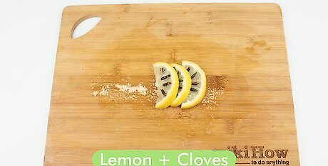 Slice a lemon and stick cloves in it. Take a small lemon and slice it into several thin slices. Take one slice and cut it in half so you have 2 semi-circles. Stick 3 to 4 whole cloves into each lemon half slice. Save the other slices to make more drinks or use them in another recipe.