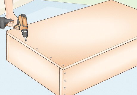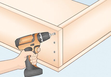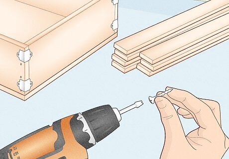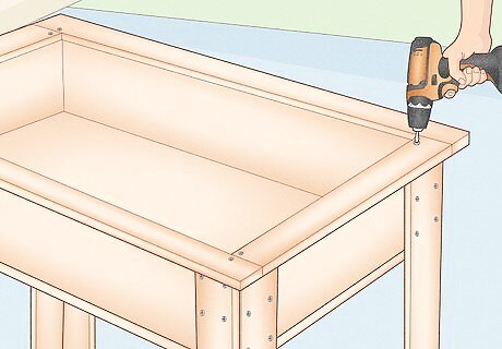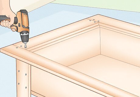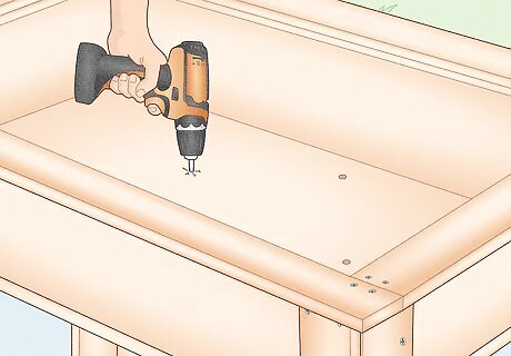Attach the base to the frame with 2 in (5.1 cm) screws. Set the base of the planter box on top of the frame so that the edges of the base line up with the edges of the boards. Use a pencil to mark a dot for a screw at each corner. Mark 3 more evenly spaced dots along the length of each long side between the corners, and 2 more between the corners on the short sides. Drill your 2 in (5.1 cm) screws straight down through the base and into the narrow edges of the frame underneath. To help secure the base in position while you drill it, add some wood glue to the outer edges of the base board before setting it on the frame. If you don’t have a drill driver or electric screwdriver, drill some pilot holes in the base and frame before putting in the screws.