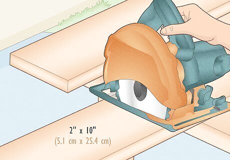 Cut 2 equal pieces of 2 in × 10 in (5.1 cm × 25.4 cm) board for the long sides. The longer sides of the frame need to be the same length as the long sides of the base. Use a measuring tape to measure out the correct length on a 10 ft (3.0 m) long, 2 in × 10 in (5.1 cm × 25.4 cm) board. Use a straight edge, such as a ruler or carpenter’s square, to help you mark off the line where you’ll be making your cut. Cut a second board of the same length. For instance, if you’re making a planter that’s 3 feet (0.91 m) long, the long side pieces should each be 3 feet (0.91 m) long. A circular saw will work best for making this kind of cut, but you can use a good handsaw if a circular saw isn’t available. Put the board on a stable surface, such as a sawhorse.