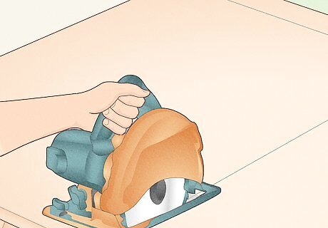 Cut the plywood to the correct size with a circular saw. Put the plywood on a stable surface, such as a work bench or sawhorse. If you can, get someone else to help you hold the board steady while you cut it. To get a smooth cut, look for a carbide-tipped blade. You may even be able to find a blade that’s labeled for use with plywood. Set the better side of the board face-down for smoother, easier cutting. Always wear safety goggles when using an electric saw! You might also wish to wear ear plugs and a dust mask. If you don’t have a circular saw, a table saw or a high-quality hand saw will also work.