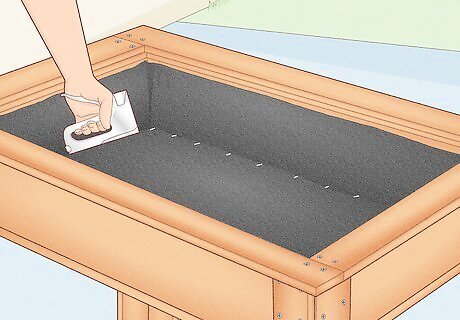 Line the planter box with landscaping fabric to protect the wood. Adding a lining will keep the wood in your planter from rotting as quickly. It will also prevent the soil from running out through your drainage holes. Use landscape fabric or a piece of plastic with small holes in it so that water can still drain out through the lining. Use nails or a staple gun to fasten the edges of the liner in place inside your planter box.