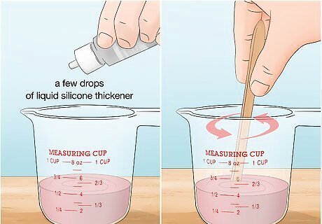 Add a few drops of a liquid silicone thickener to the mixture. Once the pigments have fully combined into the silicone mixture, add a few drops of the silicone thickener and stir it well with your stir stick. Continue stirring until the mixture reaches a thick, peanut butter-like consistency. Add a few more drops if the mixture is still too thin after you stir it. You can find liquid silicone thickener online.