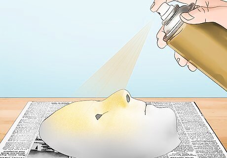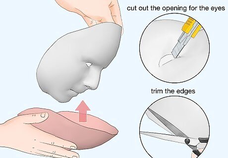 Pull the mask out of the mold, cut out the eyes, and trim the edges. Once the mask is fully dry, grip it with your fingers and pull it out of the silicone. Brush off any loose pieces and use a pair of scissors or a utility knife to trim any jagged edges so they’re smooth. Use a utility knife to cut out the openings for the eyes. Use a fine-grit sandpaper to gently sand the surface of the mask if you want it to be smoother.