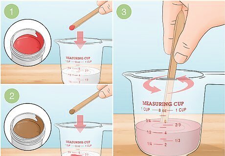 Use a small dipstick to add a tiny amount of red and brown silicone pigments. Silicone pigment is a colored liquid silicone that adds color and helps the silicone combine. Take a clean, small dipstick and insert the very end of it into the container of red silicone pigment. Add it into the Gel-00 mixture. Then, dip the other end of the stick into the container of brown silicone pigment and add it into the mixture. Use your stir stick to stir the mixture well so the colors blend together. You can use any color of silicone pigment that you want, but red and brown will create a dark mold for you to use. Silicone pigments will help to thicken the mixture and add color to the mold. You can find silicone pigments online.