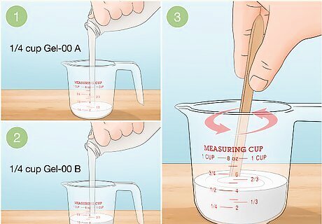 Combine equal parts of parts A and B of Gel-00 in a clear container. Gel-00 is a clear, liquid silicone that comes in 2 parts that need to be combined to be activated. Use a clear container so you can see the silicone mixture and a measuring cup to measure out and pour equal amounts of both parts of the Gel-00 into the container. Stir the mixture with a stir stick to combine it. To make 1 mold, use about ⁄4 cup (59 mL) of each part. You can find Gel-00 on special effects websites online.Tip: Use a scale to weigh each part so you can be sure you add an equal amount of both.