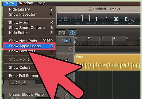 Use Apple loops. Logic Pro X provides a large amount of pre-created audio loops for those who want to use them in their project. Navigate to the "View" window and select "Show Apple Loops". Select the loop you want to use based on the categories that are shown. Clicking on multiple categories narrows down your options. Drag the loop and drop it into the area labeled "Drag Apple Loops Here".
