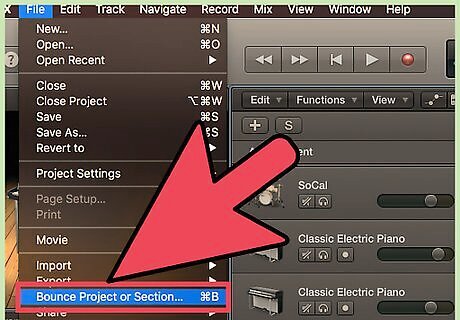 Bounce your project. Whether you are finished with a draft, or the final, Logic Pro X allows you to bounce this project as a variety of different formats based on your needs. ("Bouncing" refers to creating one individual track that is made up of a number of tracks that you select.) You can track out your project as a different audio tracks for mixing using another software, such as Pro Tools. Navigate to the "File" option in the top bar, and select "Export" and then click on "All Tracks As Audio Files". Select the format of the files, and click "Bounce". You can bounce the entire project, or a selected few tracks, to listen to it as if they were a finished song (at that point.). Select the particular tracks that you want to hear in the bounce. Navigate to the "File" option in the top bar, and select "Bounce", and then click "Project or Section". Specify your formatting options and select "Bounce".