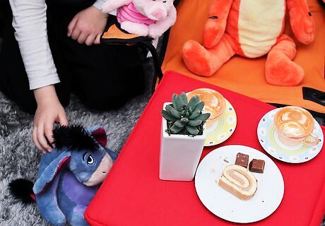 Set up the tea party. Choose a suitable spot and find the gear needed for the party. You can use doll's tea sets or real cups, depending on what you have at home. Another alternative is to buy cups, saucers, and the like, from a thrift store, just for such occasions and keep these aside in a box. They can be washed before and after use, and be reused again and again. Set the table or lay a blanket on the grass. Put out dishes of food and plates for the dolls and toys to eat from. Add glasses or cups for the drinks. Include a centerpiece for decoration. Set up anything else that your child thinks would be nice as part of the tea party.