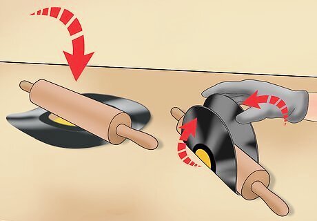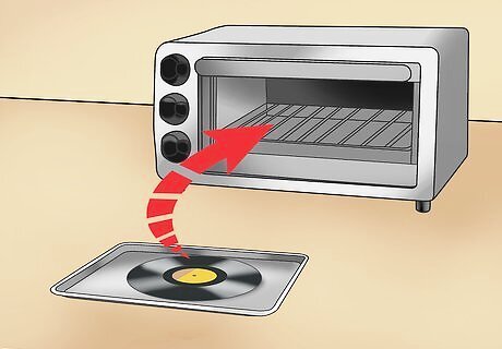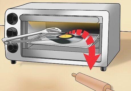 Heat the record in an oven or in boiling water. Place the record on a baking sheet, then bake it for 2 minutes in a preheated oven at 200 °F (93 °C). Alternatively, place the record into a sink filled with boiling water, and leave it there until it turns malleable, about 1 to 2 minutes. Be aware that the label may discolor in the hot water. It should not discolor in the oven, however.