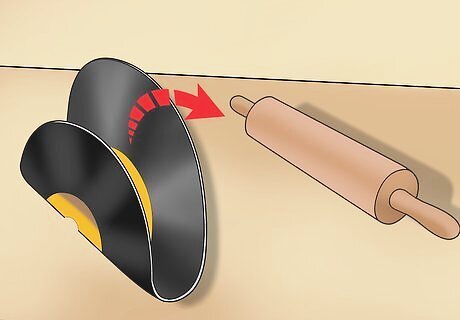 Fold the bottom edge of the record over a heat-safe cylinder. Find a long, narrow glass, bottle, or rolling pin. Place it on top of the record, just below the label. Using gloved hands, wrap the bottom edge of the record over the heat-safe cylinder. Wear heavy-duty rubber gloves or oven mitts for this. Do not handle the record with bare hands. You can also use a tray, plate, or other item. The goal is to create a lopsided taco shape.