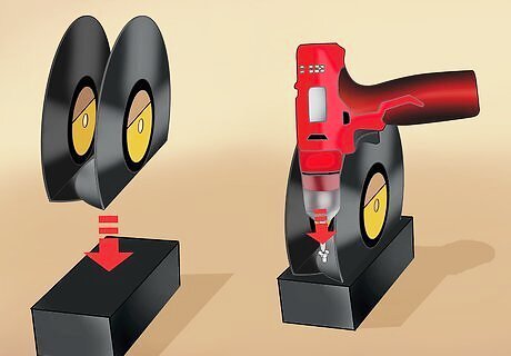 Secure the records to the block. Keeping the records overlapped, place them on top of the block. Secure them to the bock with strips of tape. Drill 2 screws through the records and into the block, 1 at each end. Remove the tape when you are done. Alternatively, you can use industrial-strength glue. Glue the first record to the block, then glue the second on top. Secure them with tape until the glue dries.
