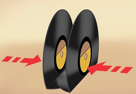 Overlap the records to create a U-shape. Rotate the records so that the shorter ends are parallel to the floor and the longer ends are sticking straight up. Turn the records so that they are facing each other, then move them together so that the narrow ends overlap completely. You'll get a rough U-shape.
