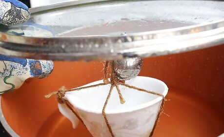 Boil the water for at least 20 minutes. Bring the water to a rolling boil, then immediately place the lid on the pot upside down, so that the cup hangs in the pot under the lid. The water in the pot will vaporize as the water boils. The vapor will condense and drink into the cup. As the water vaporizes, all microorganisms are killed. Heavy metals, salts, and other chemicals are also removed.