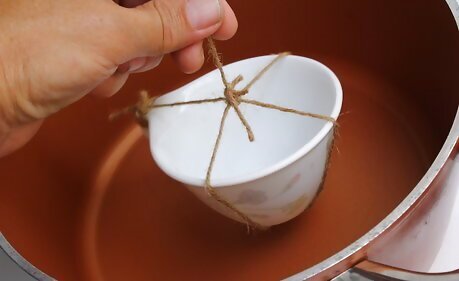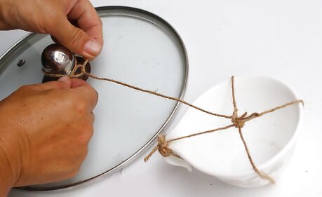 Tie a cup to the handle of the pot's lid. Using your twine, tie the cup to the pot's lid so that when the lid is upside down, the cup is suspended below it. Make sure the cup is hanging right-side up so that it will fill with water. Experiment with wrapping the twine around the cup to cradle it so that it stays upright. If it's tilting, it won't get as much water.