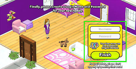 Make your username and password. Lastly, if you didn't choose to log in with an existing Webkinz Classic username and password at the beginning, create your username and password for Webkinz Next. Only you or your child will see this information, as other users will see your world name instead. Your username and password will be what you use to log into the game and will not be used for anything else. Once you've chosen your username and password, click Finish to start playing with your new pet.