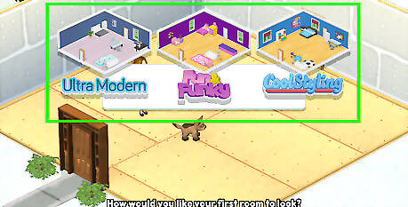 Create your first room. After choosing a world name, Ms. Biscuits will take you to your pet's new home. Choose which of three styles of room you would like to have. You can customize the room afterward.