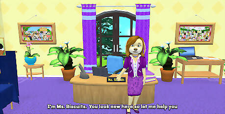 Meet Ms. Biscuits. Ms. Biscuits runs the Adoption Center in Kinzville and will guide you through the account creation process. If you choose to adopt more pets on Webkinz Next, you will go to the Adoption Center to adopt them with Ms. Biscuits again.