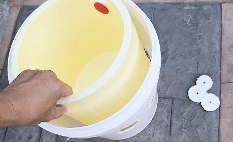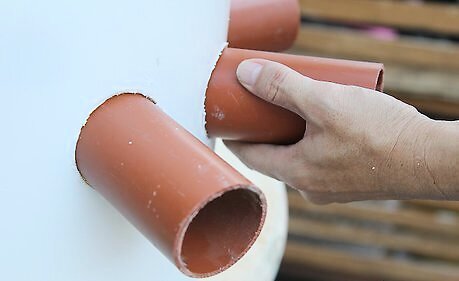 Push one piece of PVC pipe through each hole so at least half of the pipe is inside the bucket.