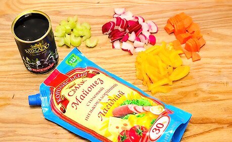 Gather your ingredients. Here's what you'll need to make a chicken noodle salad: Mayonnaise Chicken (cut into small pieces) Carrots (chopped) Black olives Celery (chopped) Radishes (chopped) Yellow peppers (chopped) Noodles Any other vegetables of your choice