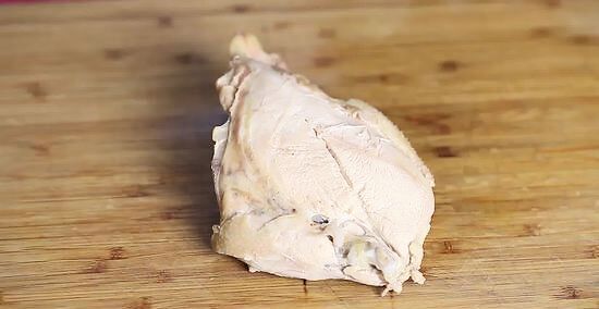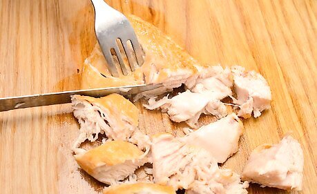 Remove the chicken from the refrigerator and begin shredding with a knife and fork.
