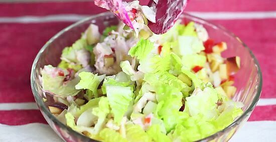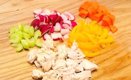 Prepare all the vegetables and chicken you want in the salad by cutting them into small pieces (dime or nickel sized).