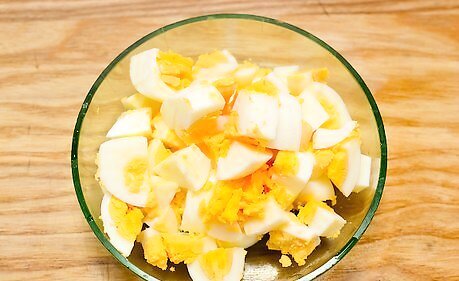 Peel eggs and gently cube them up. They should be about 1/4" cube.