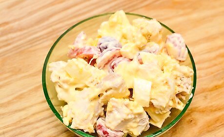 Gather your ingredients. Here's what you'll need to make a southern chicken salad: 4 boneless chicken breasts 3 hard-boiled eggs 1/2 grapes, halved, or 1/4 cup raisins (optional) 1/2 cup light mayonnaise 1 tablespoon dill relish 1 tablespoon lemon juice 1 tablespoon honey 1/4 tablespoon celery seed 1 teaspoon garlic powder 1 teaspoon onion powder 1 teaspoon basil Salt & pepper